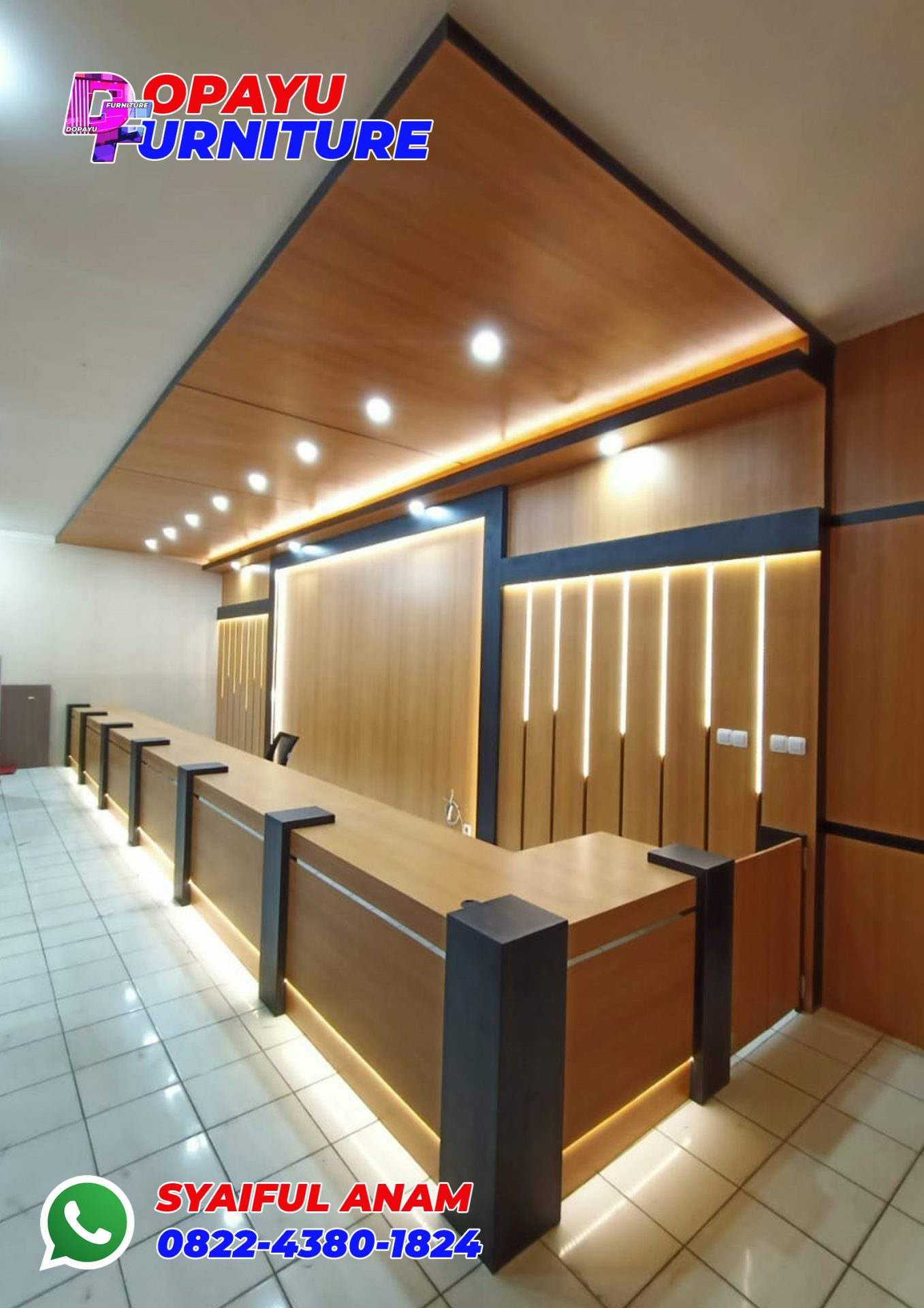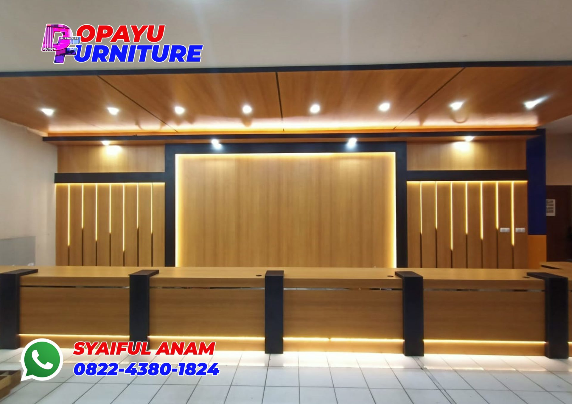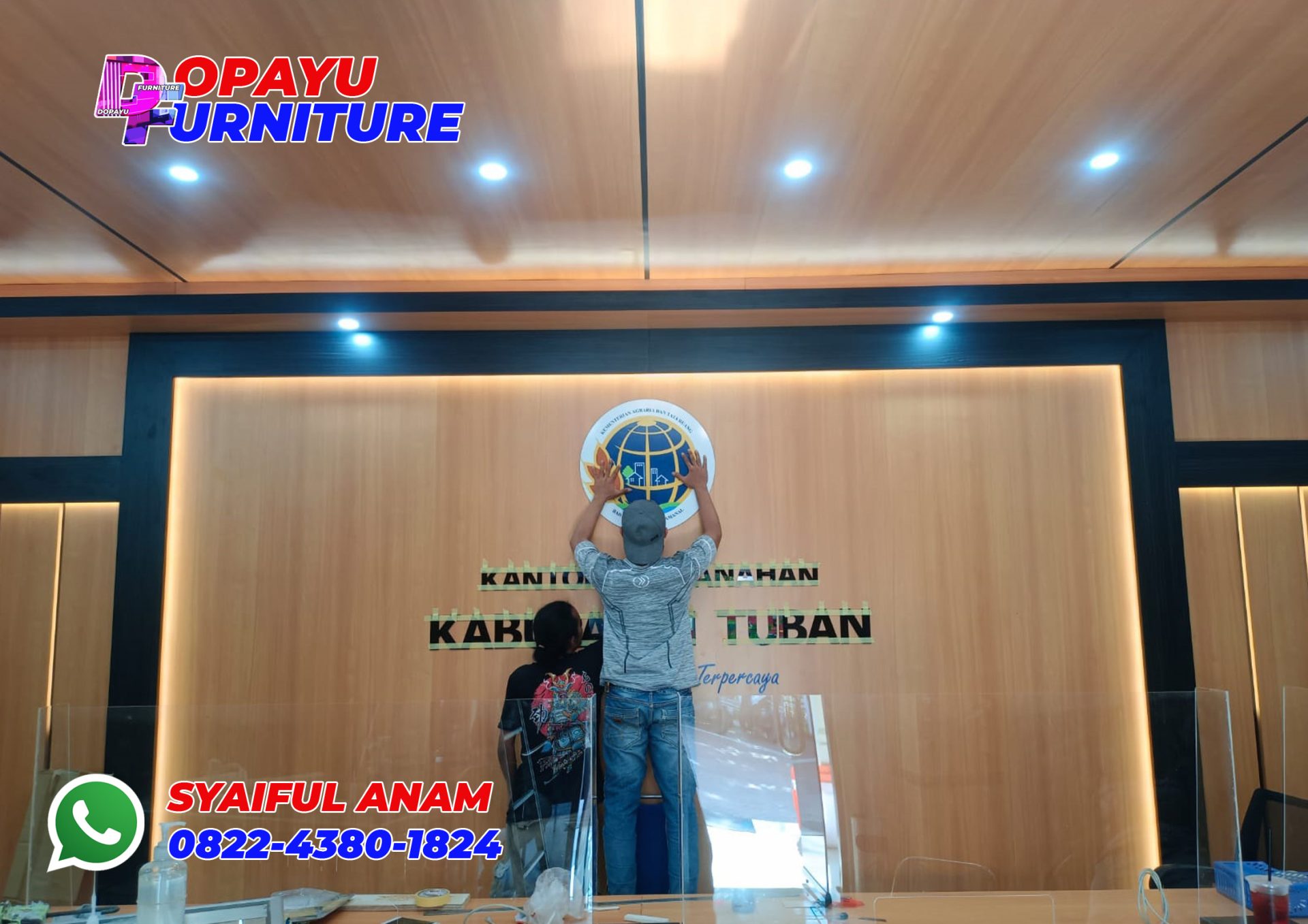 Pekerjaan kita kali ini untuk mempercantik area resepsionis Kantor Pertanahan Kabupaten Tuban. Dopayu buatkan backdrop dan meja resepsionisnya. Menggunakan multiplek finishing HPL motif kayu. Tak lupa juga ditambah dengan down light dan LED.