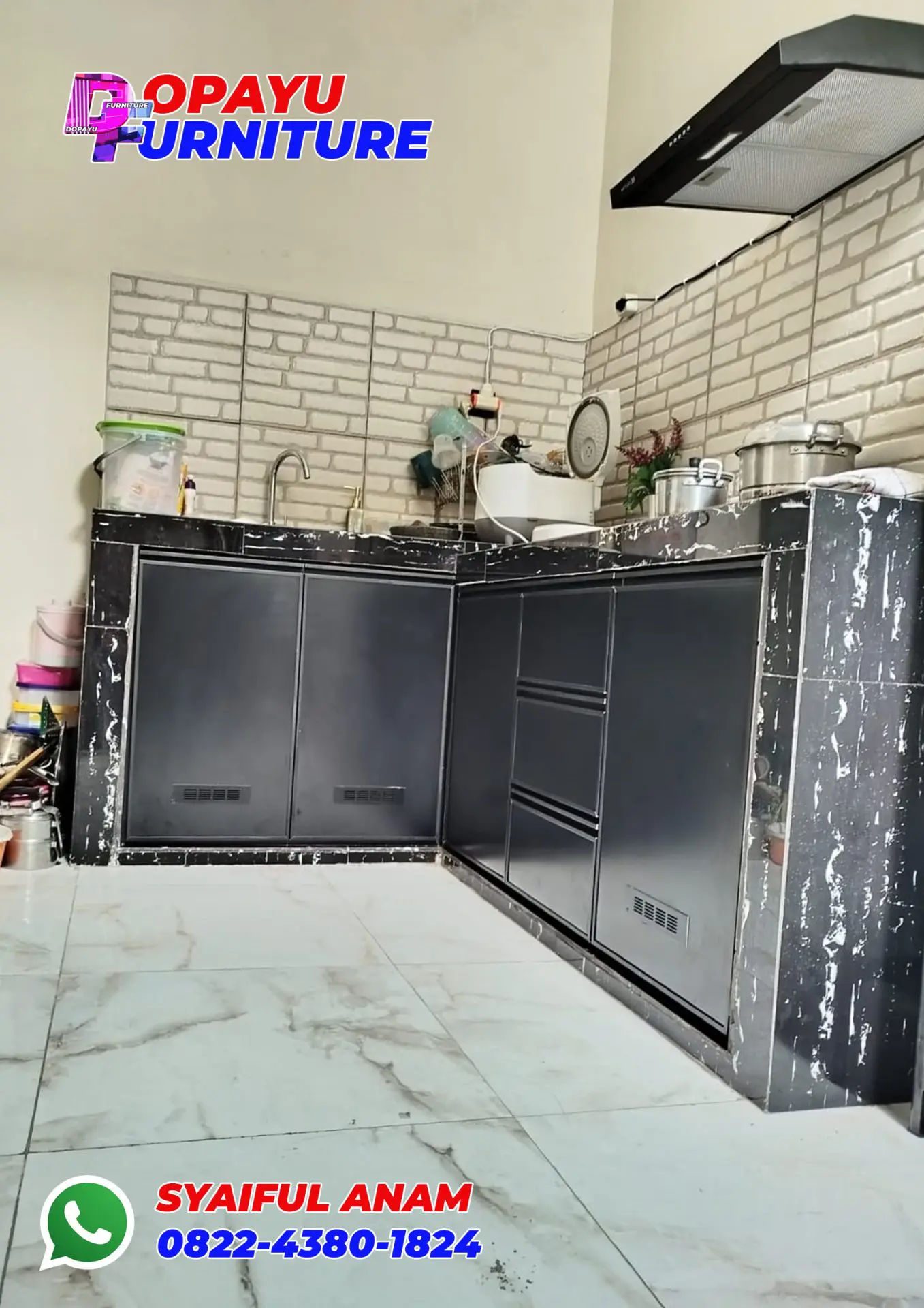 Dopayu diminta untuk membuatkan kabinet berbentuk letter L di area dapur yang cukup luas. Karena mejanya berwarna hitam, customer minta dibuatkan kabinet warna hitam biar sesuai.