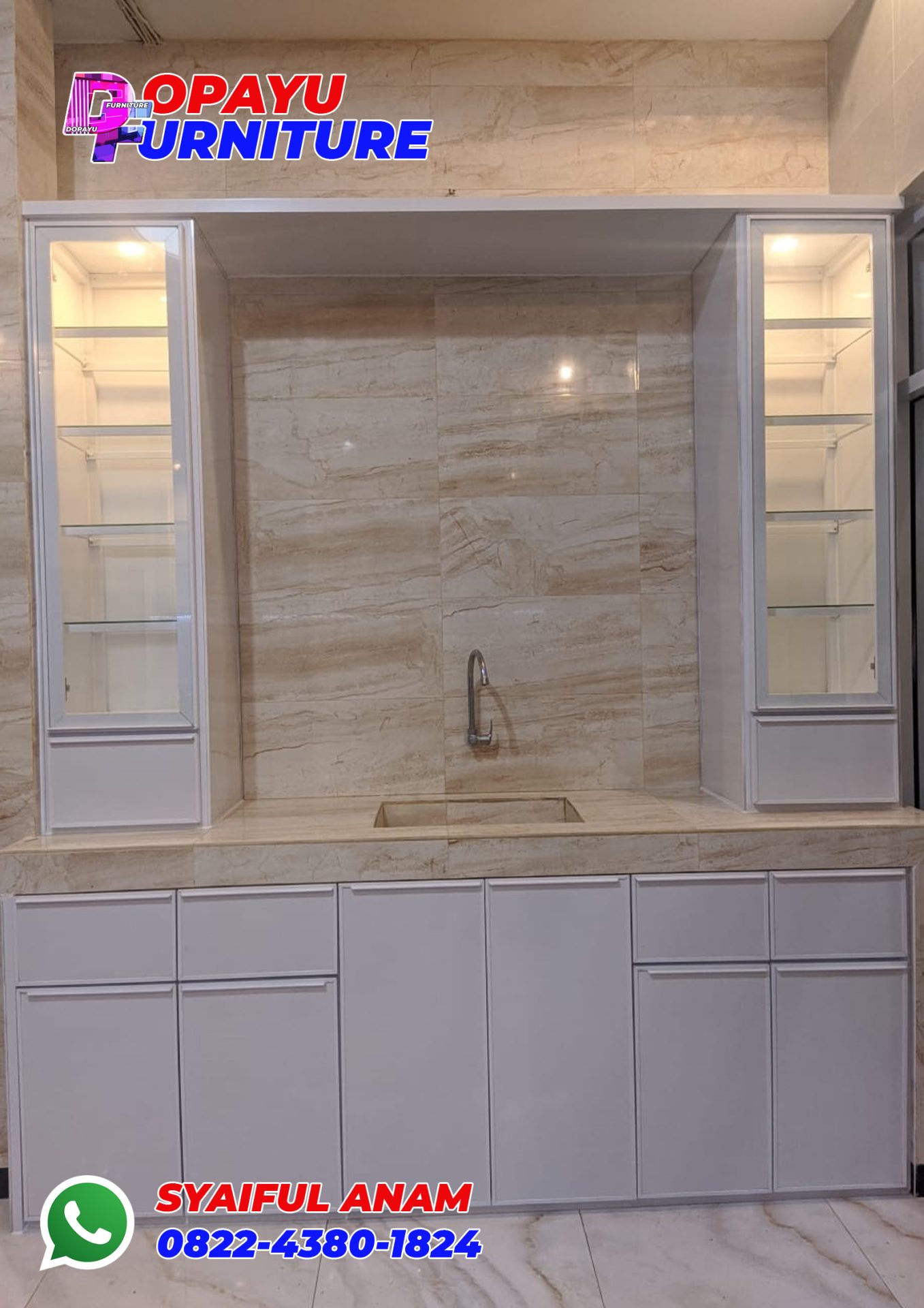 Jika anda mau buat kitchen set aluminium frameless baik warna putih, hitam ataupun bermotif bisa hubungi Dopayu.